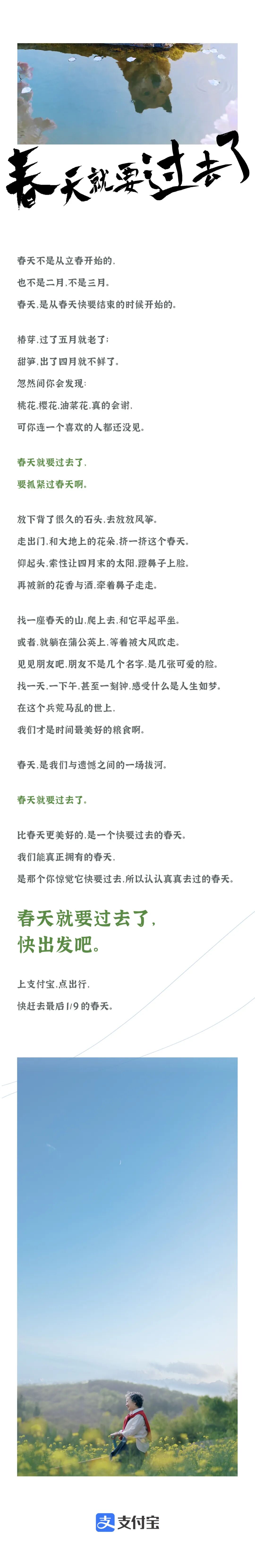 于是支付宝顺势而为,抓住消费者「惜春」这一受众情绪,以「春天就要过去了」为传播主题,呼吁人们别错过春天的尾巴。
