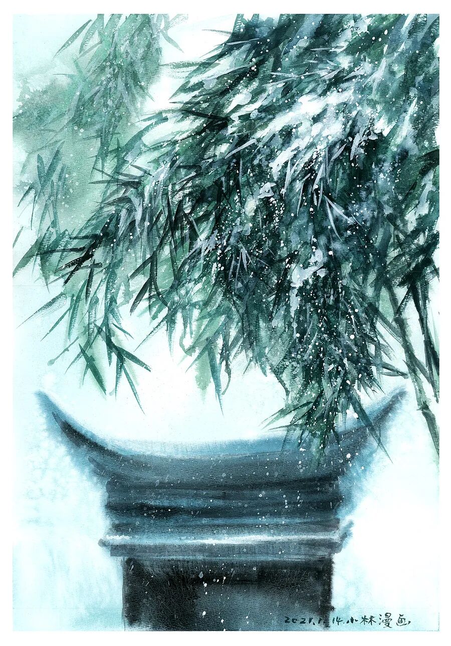 今天的水彩画,小林自己最喜欢的,是没人的竹子那张: