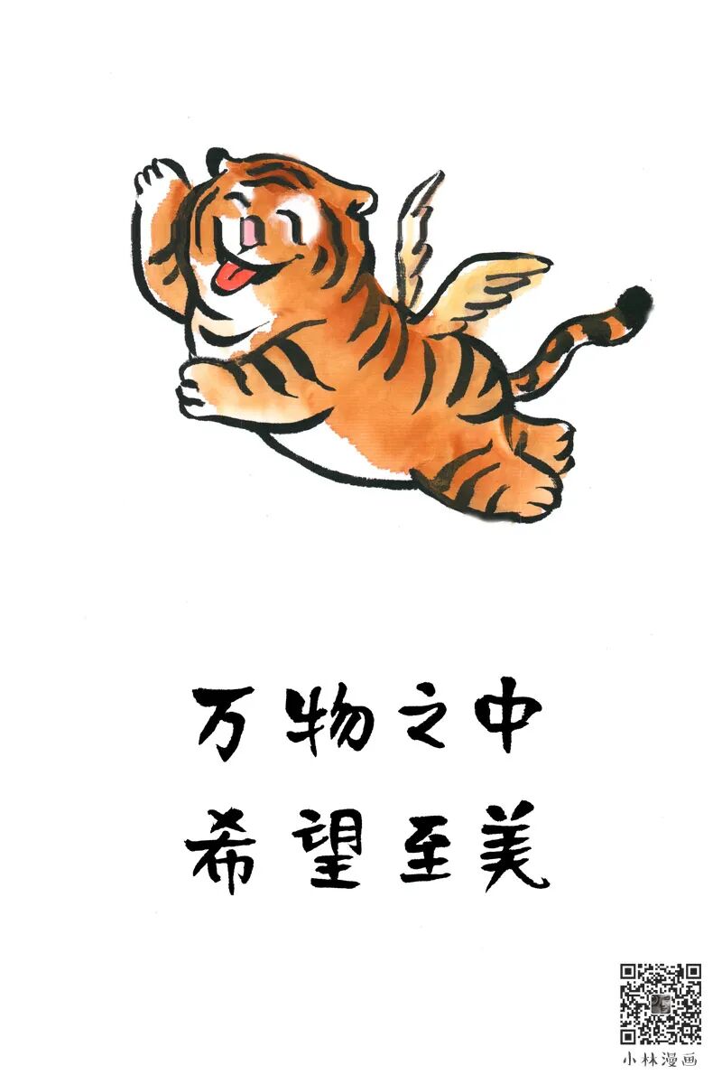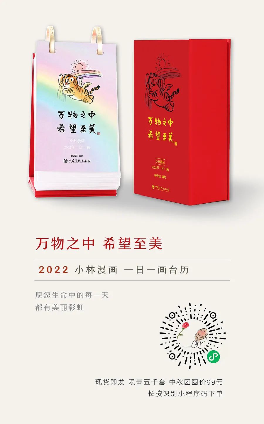 2022年小林漫画一日一画的台历,主题定为“万物之中,希望至美”,希望未来的一年,有希望,有盼头,每天有每天的美好。明年是虎年,所以小林还特地为日历画了插上翅膀的小老虎: