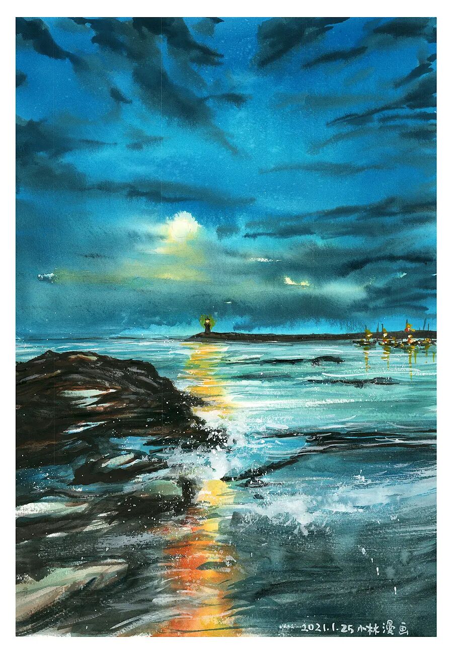 下面这张,是近日自己最喜欢的一张,记得那年流浪到青岛的时候,在栈桥边见过月亮升起在海面上,波光流动,月光既冰冷又温暖,凭着印象画出来的海面月色,大概就是这个样子: