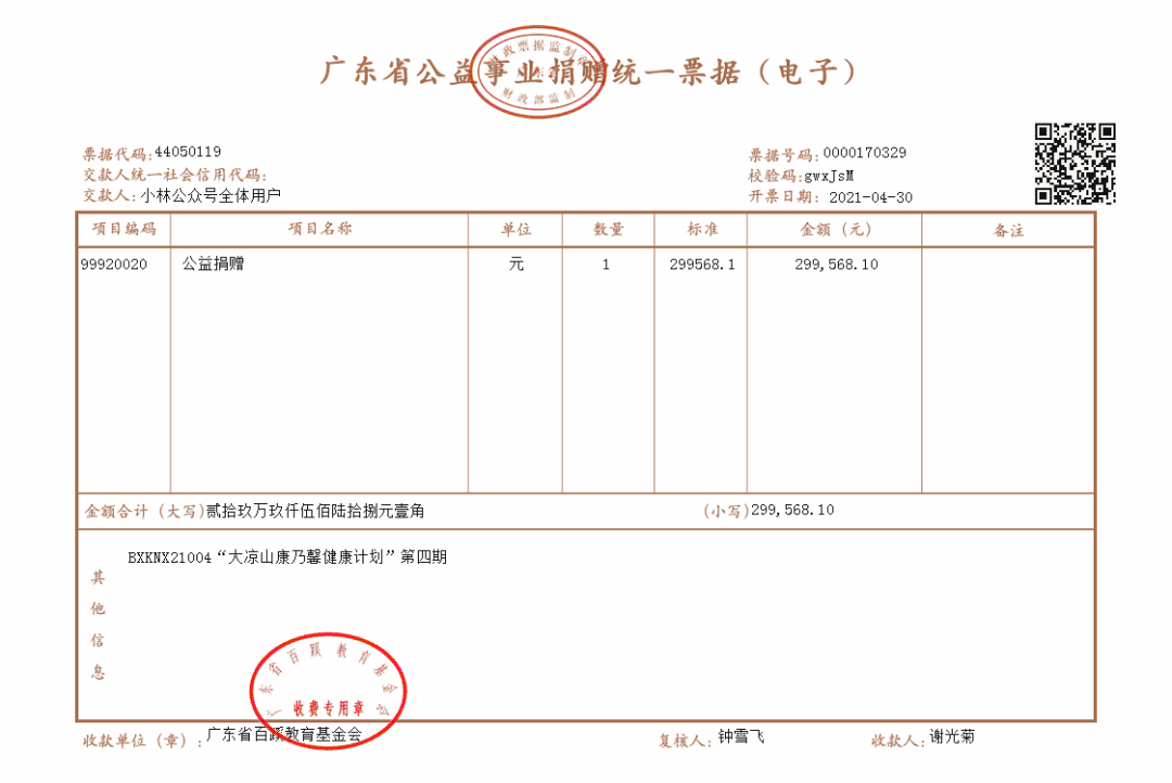 由小林公众号用户们大家集体捐助的将近三十万元人民币,已经转交百蹊公益,专门用于大凉山康乃馨女童健康计划2021年四期志愿计划的执行。