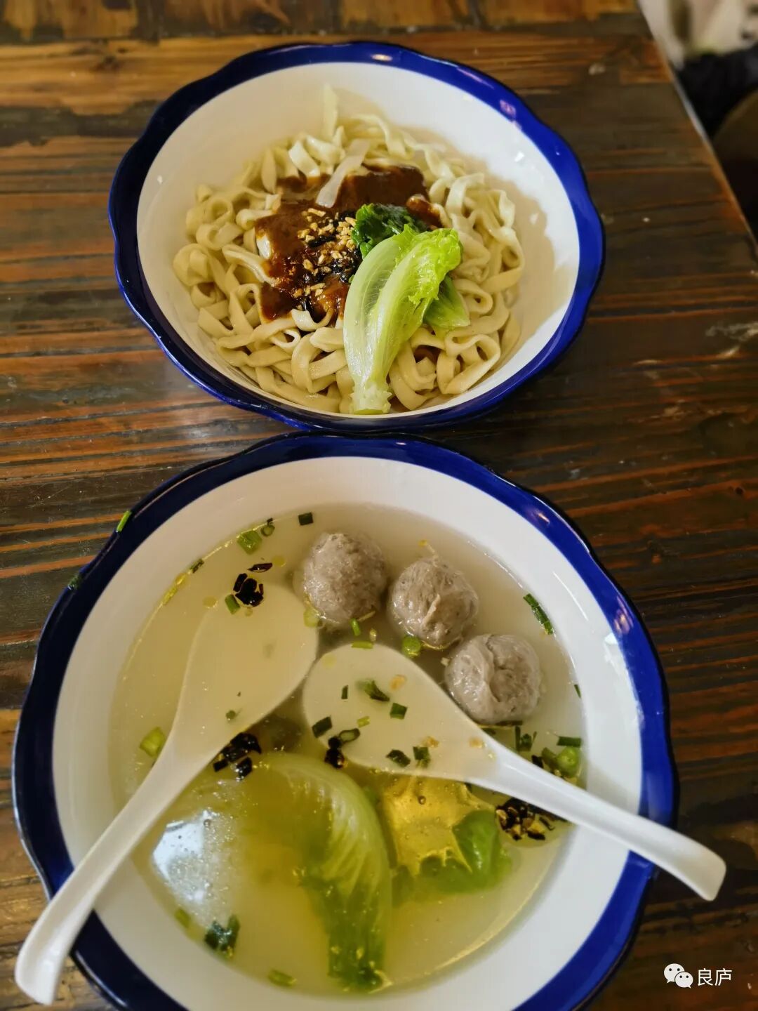 吃小吃吃不饱,又到对面一家广东人开的沙茶面馆继续吃——三个人只要一份沙茶面牛肉丸套餐,刚好溜缝儿!🤭🤭