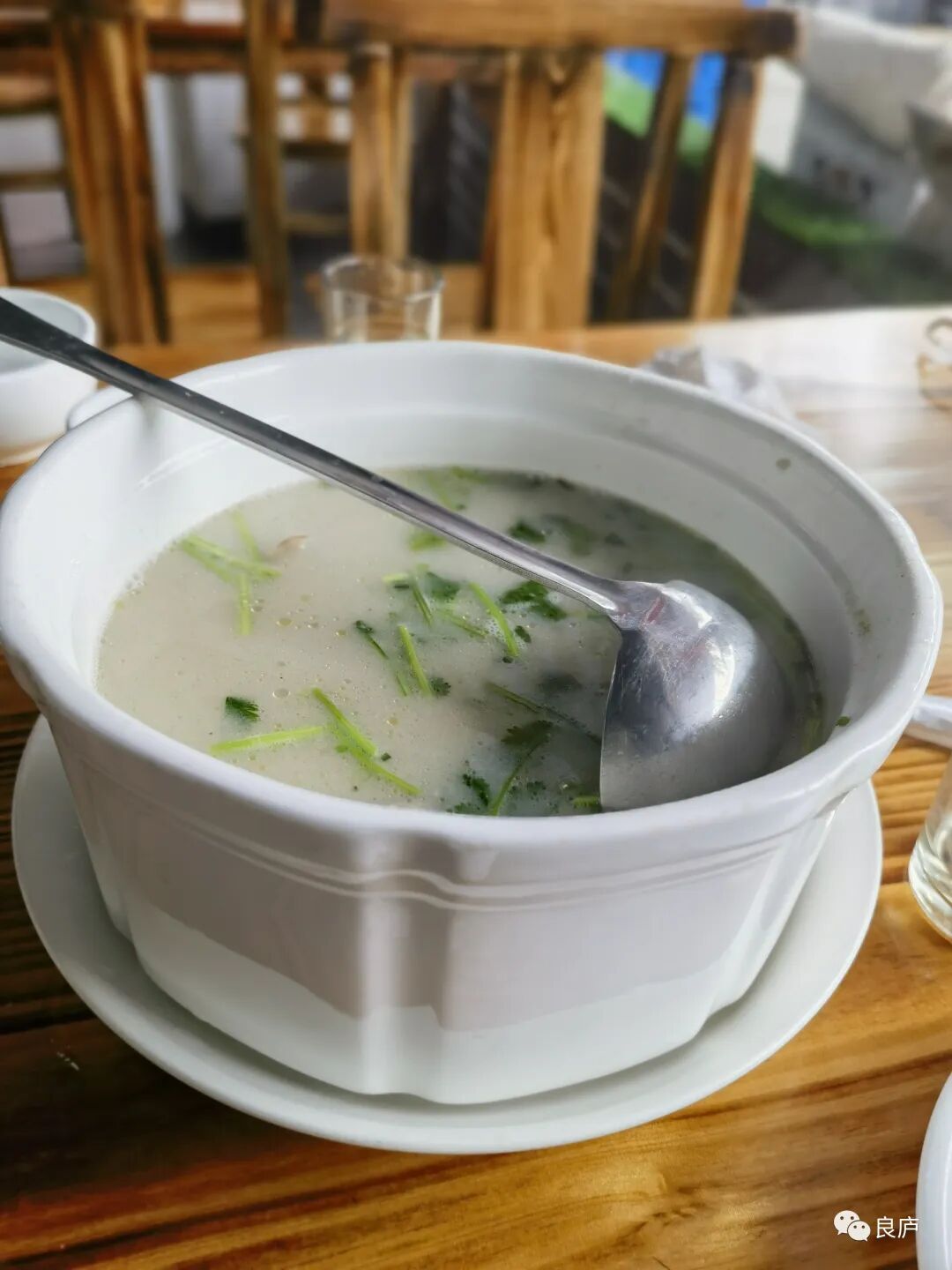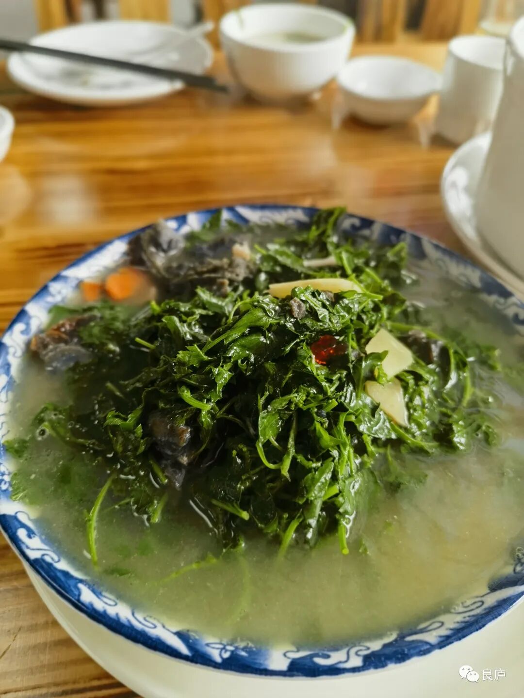 松花蛋炒野菊叶。其实这个野菊就是山东的“菊花落”,加了松花蛋,口感变得不那么苦涩,更增加了香气!后来发现,广西很多炒青菜里都配松花蛋或咸蛋,再加些高汤,虽少了青菜的清爽,但吃起来很香,对不喜欢吃青菜的人来说是个不错的选择!