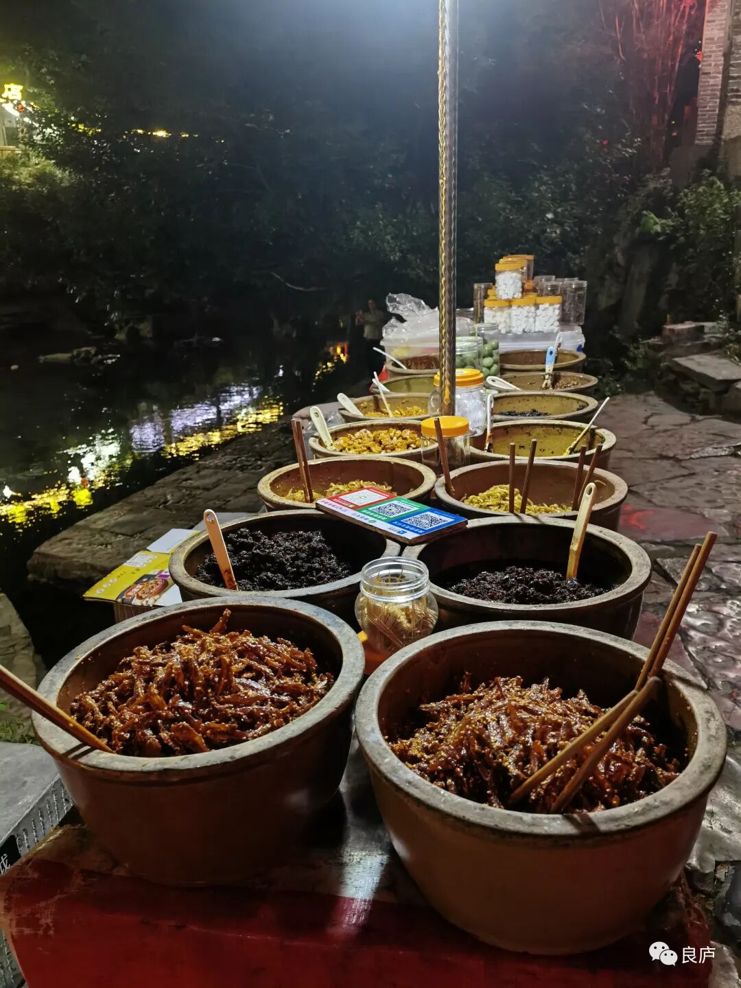 整个古镇是真正活着的古镇,镇里人家保留着古镇经商的传统,家家户户都开店,卖的多是本地特产和小吃,小孩子也会帮助大人招呼客人,走在小巷里更是时不时看到一群玩耍的孩子,古井边晚上也有人来洗衣……晚上沿河有很多小吃摊点,我们午饭吃的又迟又多,夜宵就在这河边小吃摊解决了……