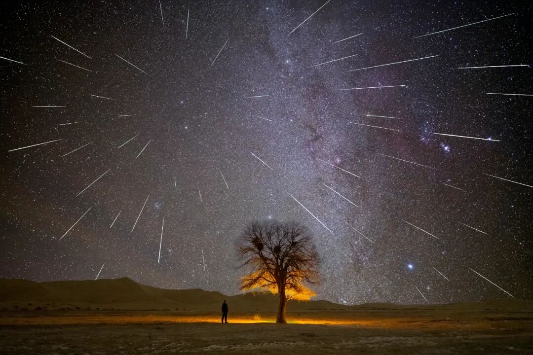 内蒙古库布齐沙漠,感受零下20的严寒,在一棵古树旁,守候2020年冬季的这场星空焰火。