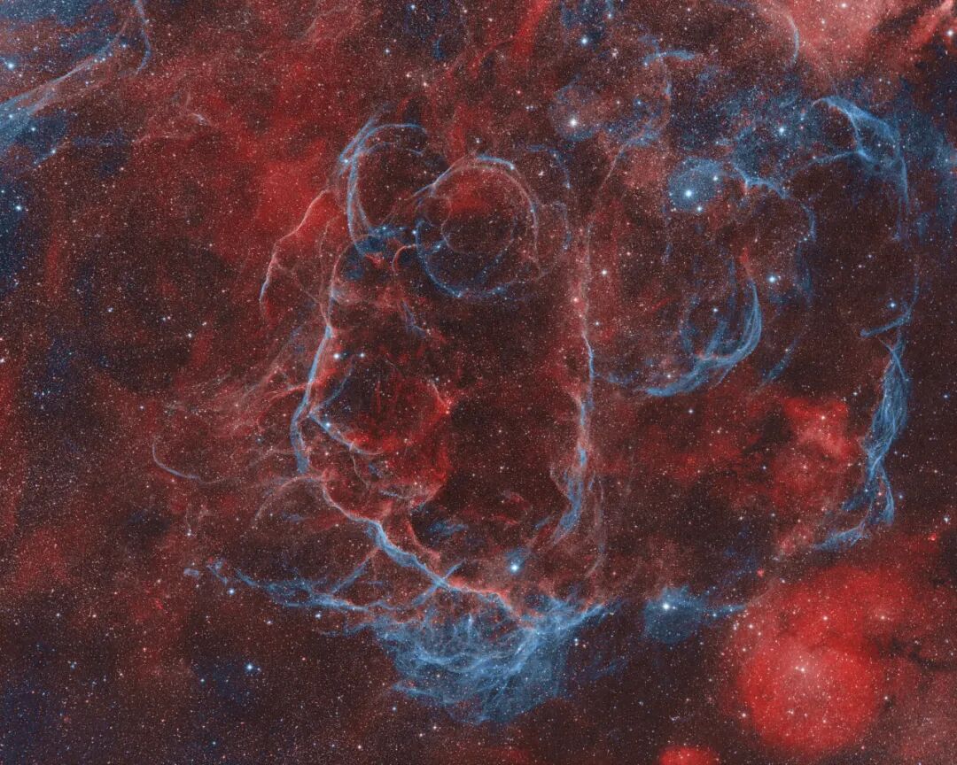 位于船帆座的超新星遗迹是一片绚烂的区域,其中包含许多美丽的丝状云气,其中的恒星活动非常剧烈,是非常热门的南天目标。