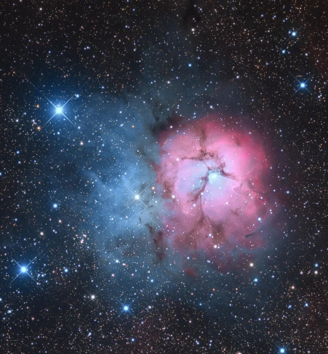 三叶星云上有三条非常明显的黑道,它的形状就好像是三片发亮的树叶紧密而和谐地凑在一起,因此被称作三叶星云。三叶星云是我最喜欢的目标之一,这回借着智利台的设备拍摄,挖掘出他的美,桃红色的三片叶子组成了一朵盛开的鲜花,旁边是一朵亮蓝色的小花,太漂亮了。