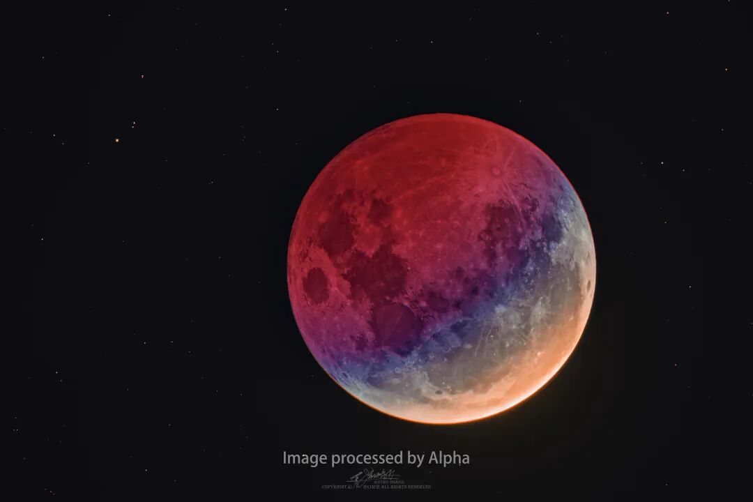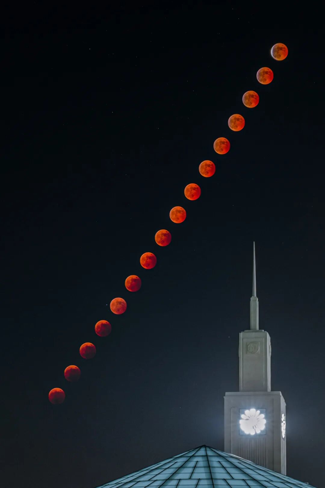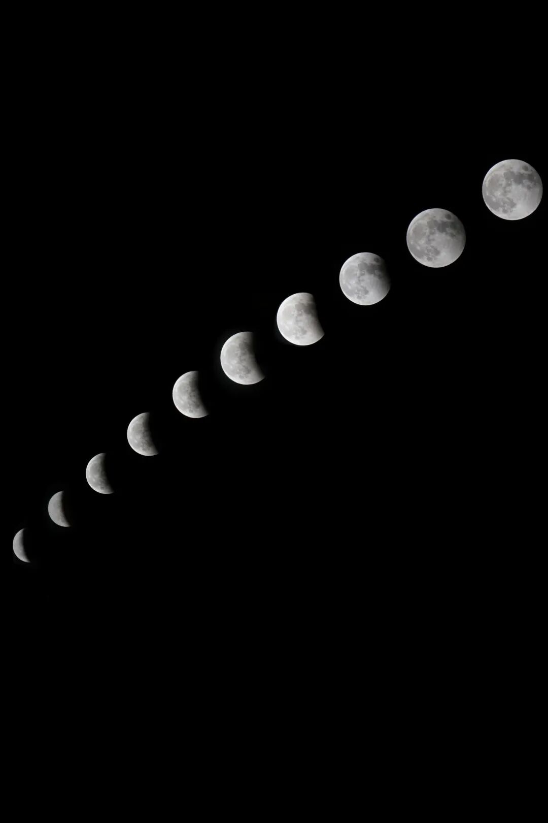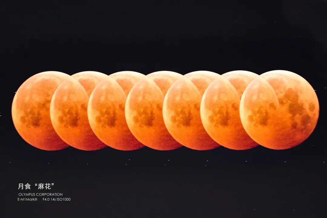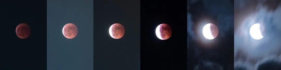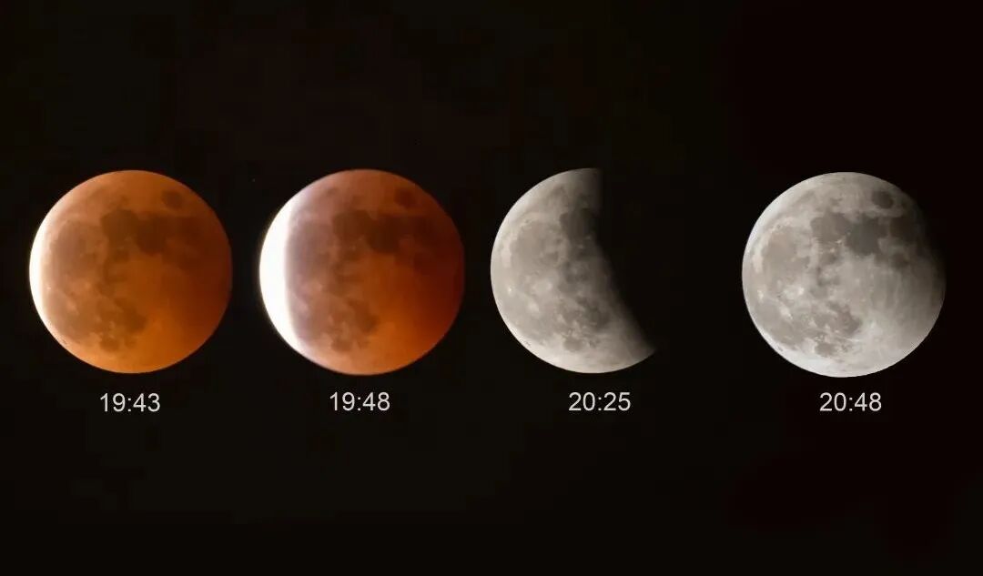 照片展示了月全食食甚期间的光影变化,可以看到月亮移动时不同的大气颜色。