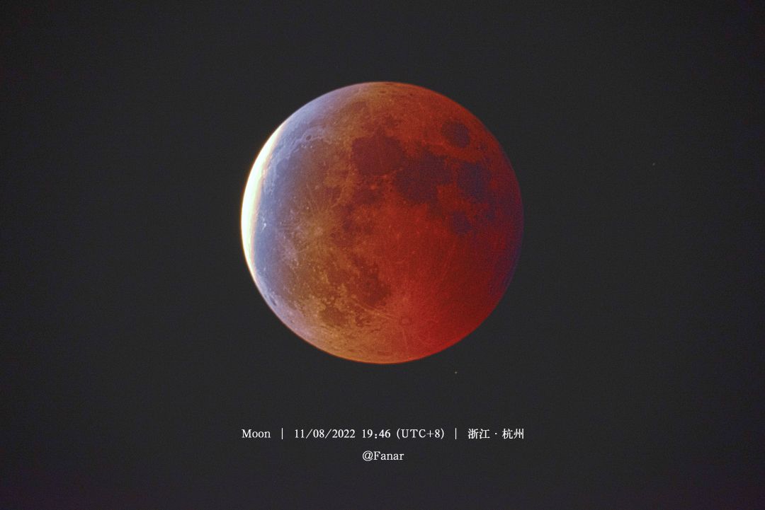 月全食是月食的一种,当月球、地球、太阳完全在一条直线上的时候,地球在中间,整个月球全部走进地球的影子里,月球表面变成暗红色,形成月全食。从地球上看去,整个月球呈现出古铜色,也就是民众所熟知的“红月亮”。广东最终无缘面见,多亏字母哥提供素材有幸参与本次月食盛宴!
