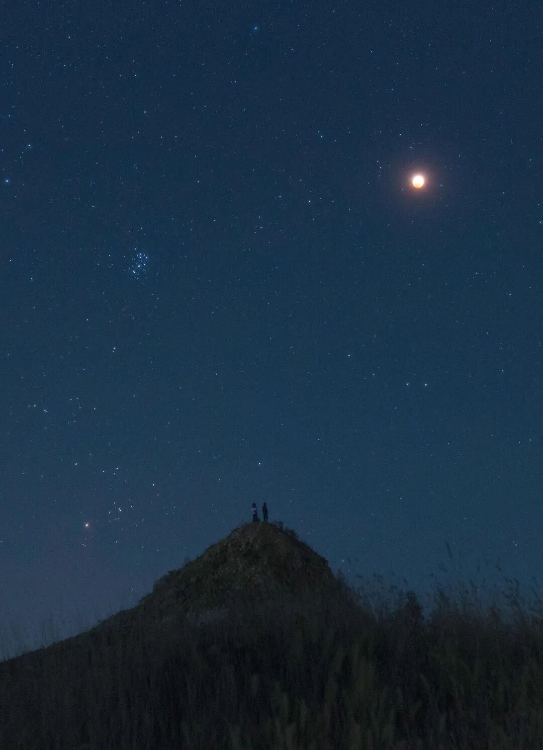 2022年11月8日,月全食。我来到岷山之巅,当月亮升起之时,地球的阴影已然将月球遮蔽。冬季银河从暗淡的月光中显露出来。遥望星辰漫天,月色如火。
