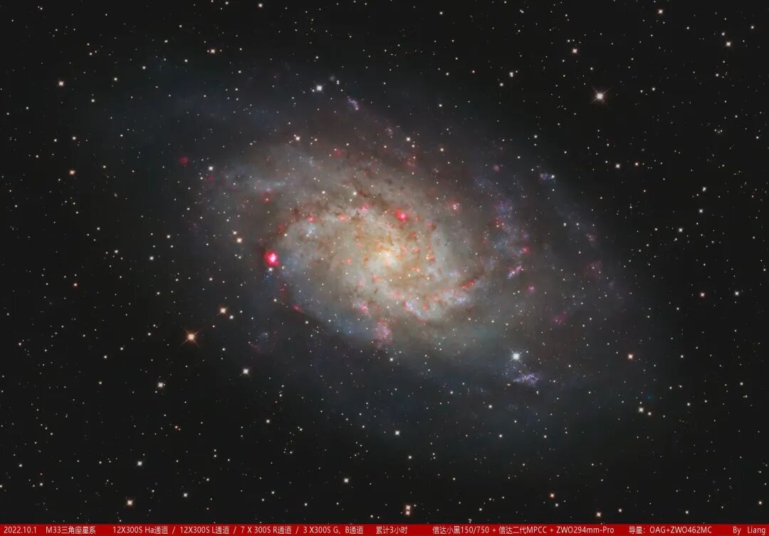 这是国庆节晚上驾车前往光害黑区进行的一次深空摄影,在波尔特3级的环境里感受黑夜的宁静,蝉鸣声不绝于耳,置身黑暗之中,仰望星空,满天的繁星跟淡淡的银河交相辉映,只用了两个多小时,就用相机拍摄出这个在本星系群中第三大的螺旋星系——M33三角座星系。