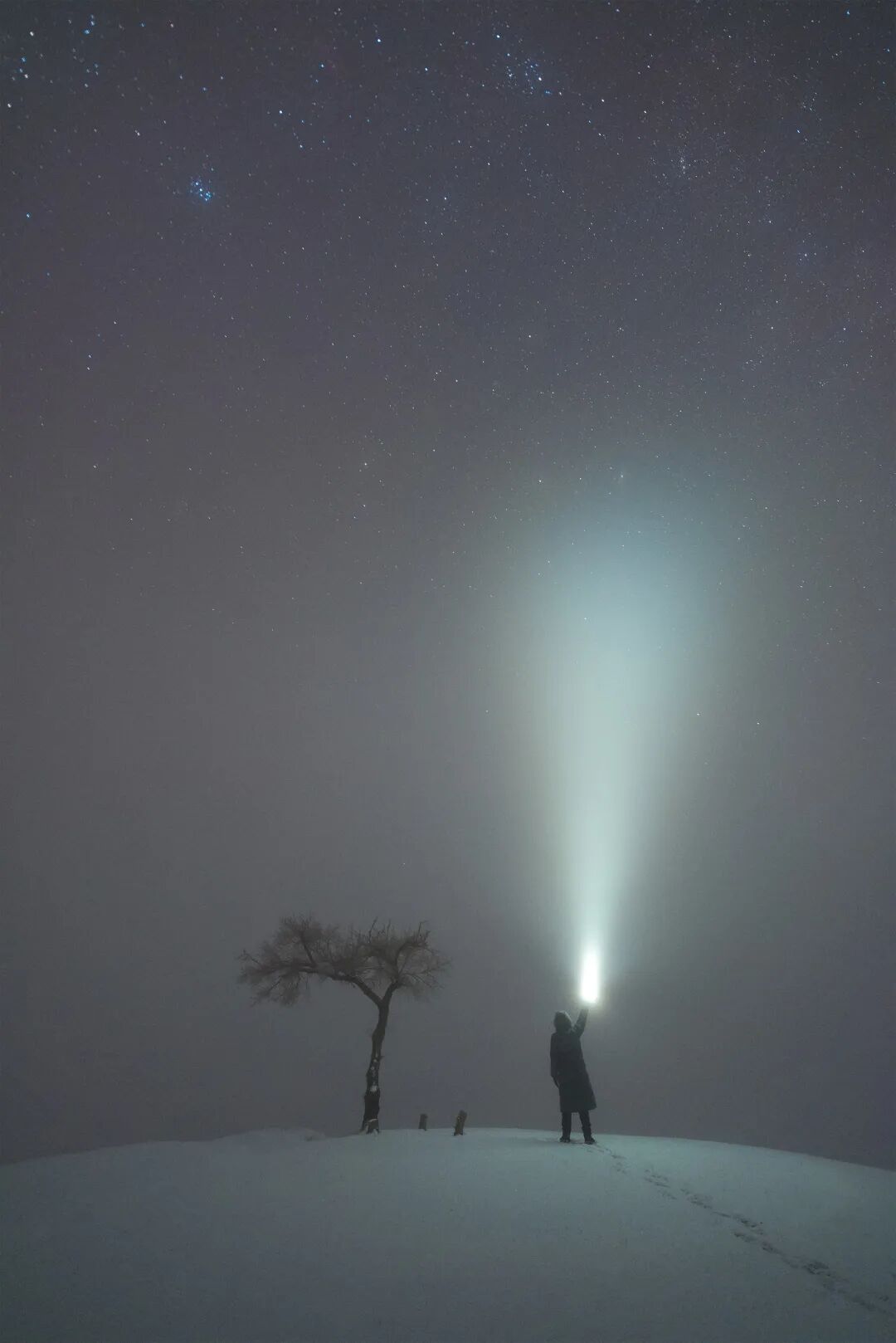 拍星夜偶遇大雾弥漫,星空虚幻时隐时现,天地一色白雾茫茫,唯一可见悬崖尽头那棵不老的神树。那是唯一可以给我安全感的参照物,若不是脚下发出踩雪咯吱咯吱的声音,真像梦里的场景,但又如此真实的摆在眼前。