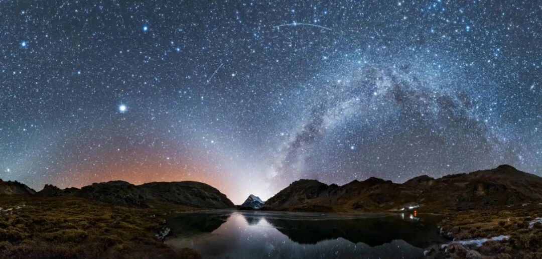 天黑后刚入夜的波拥措足以满足我对完美黑夜的所有幻想。雪山,海子,星空,银河,黄道光,气辉,银河拱桥和黄道光从仙乃日的山顶向两边跨出,各自形成一道拱桥,在极致黑夜中足够耀眼的木星被黄道光一穿而过,此时的湖边有一段短暂的无风期,波拥措的湖面倒映着满天星光,帐篷里的人们也开始出来欣赏这场足够壮观的星空奇景。