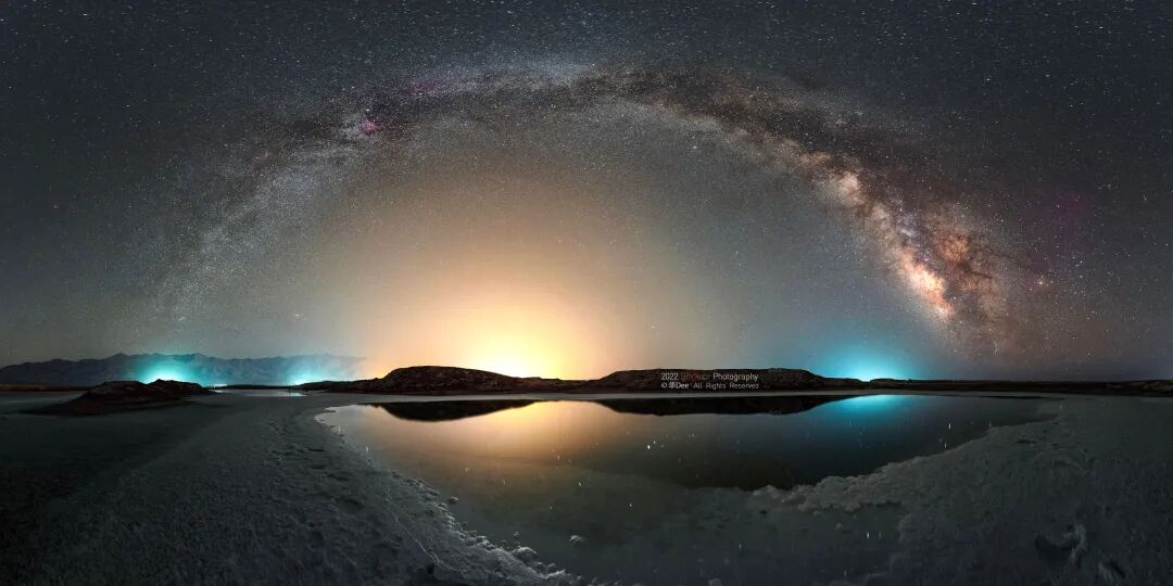 西北之旅一路奔波,到达翡翠湖已是近黄昏,匆匆找到拍摄银河拱桥的机位。待夜幕降临,银河恰似弯弯的拱桥在城镇上方缓缓升起,点点星光与人类文明构成了一幅“银河之眼”。