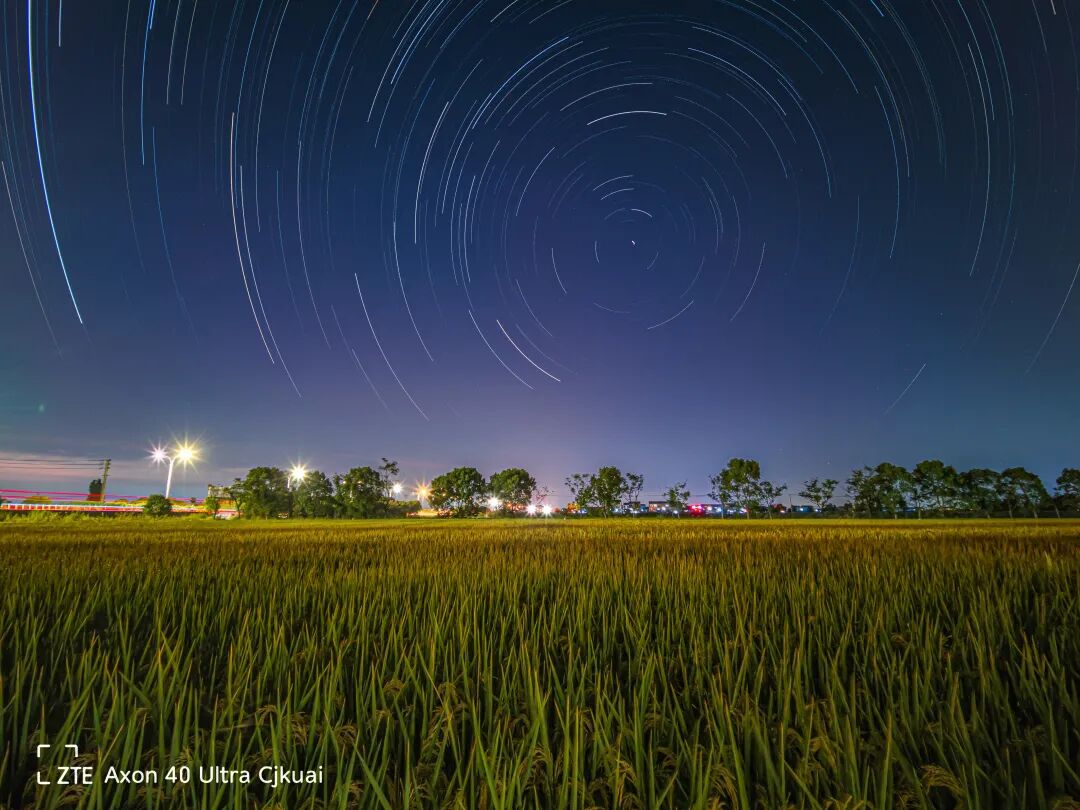 第一次想尝试城市星轨,不在市中心,在郊区的地方,六级光污染,星星可见数量相对没那么多了。用稻田做前景,手机专业模式raw格式连拍300多张,后期ps堆叠,刚好稻谷还没收割,周边也有车流经过,有车轨,有稻田。