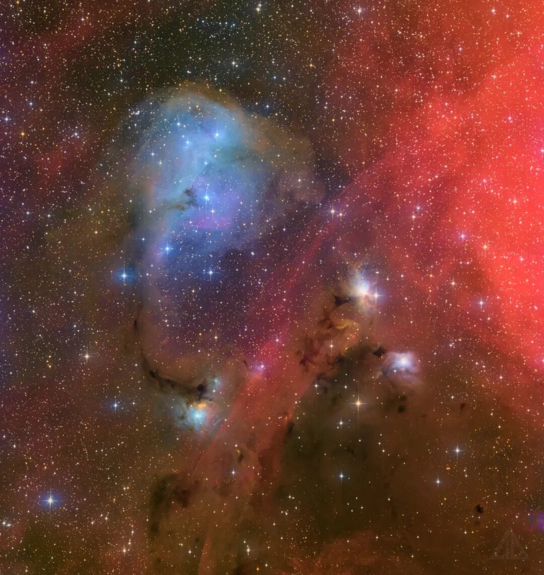IC447是位于麒麟座的一个反射星云。位于知名的圣诞树星云NGC2264边上。在这片大面积Ha发射星云区域内,这个像只鲸鱼一样的蓝色的反射星云显得尤为显眼。