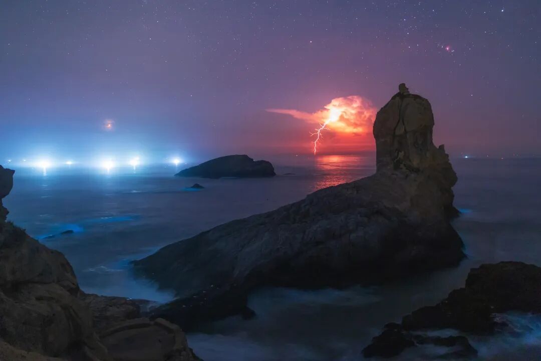 这里是距离福建陆地最远、距离公海最近的有人岛--福鼎台山岛。福建沿海的休渔季接近尾声,附近海面上的渔船亮起了明灯,夜光蓝藻随着海浪拍打在礁石上发出淡蓝色的光,海岛以东200公里处电闪雷鸣。在台山岛的东部,有一处叫做“雨伞礁”的海蚀地貌景观,是台山岛的象征,由于它三面浸入海中,一面连接海岛,状若打开的雨伞,被称为天下第一礁。巨大的雨伞礁遥望着启明星与猎户座冉冉升起。也许这并不是大部分人追求的极致暗夜,但却是能让追星人怦然心动的夜空之光。
