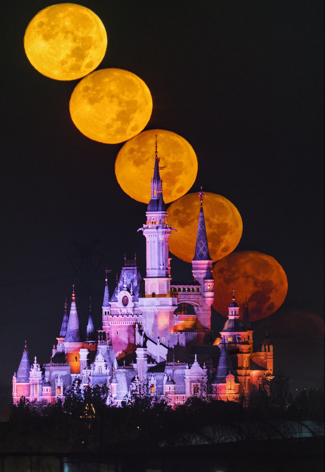 一直想将迪士尼和日月同框会非常好看,果然不出所料,月亮在城堡的尖上会有一种奇妙的化学反应,让人感觉像一座恶魔之城。