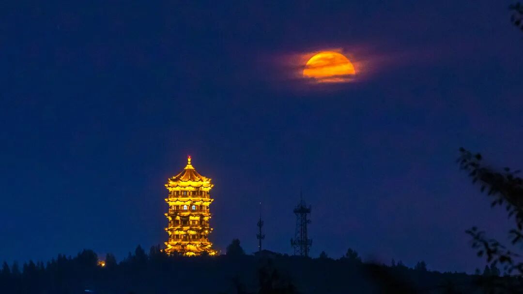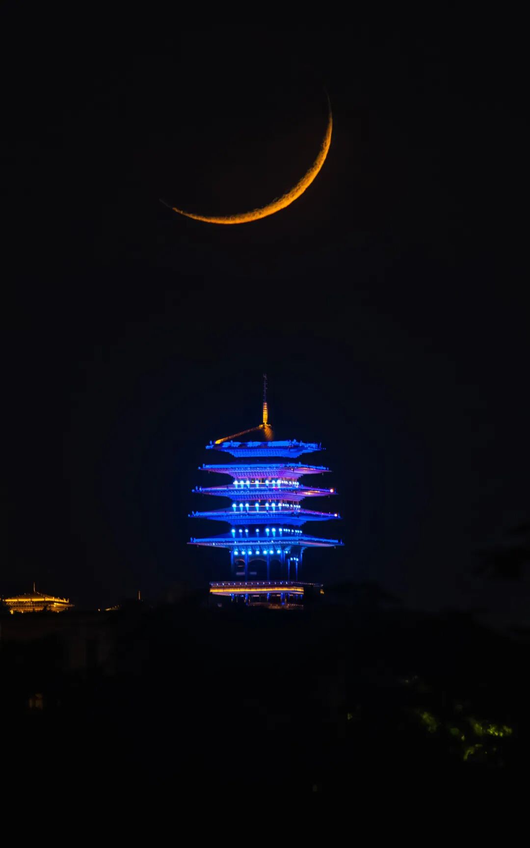 第一次长距离拍摄眉月从杭州东来阁降下。由于云层影响,这也是当天最后一张清晰可见的图像。此情此景,格外让人感慨。