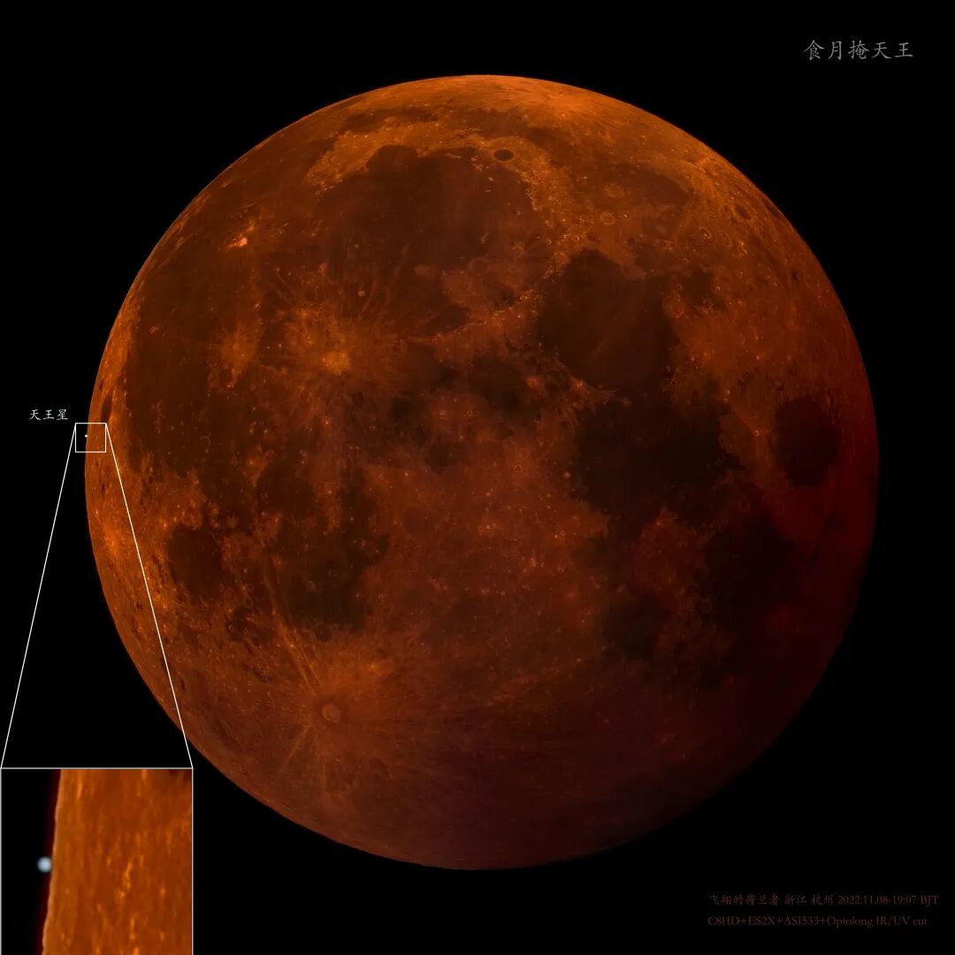 三体游戏中秦始皇文明发展出了牛顿力学体系和冯诺依曼计算机,但最终毁灭于“三星连珠”的引力叠加。那一刻,三个太阳和三体行星在一条直线上。11月8日的月全食掩天王星发生时,太阳、地球、月球和天王星也在一条直线上。幸运的是,我们只有一个太阳,可以悠哉地观看这一罕见场景。
