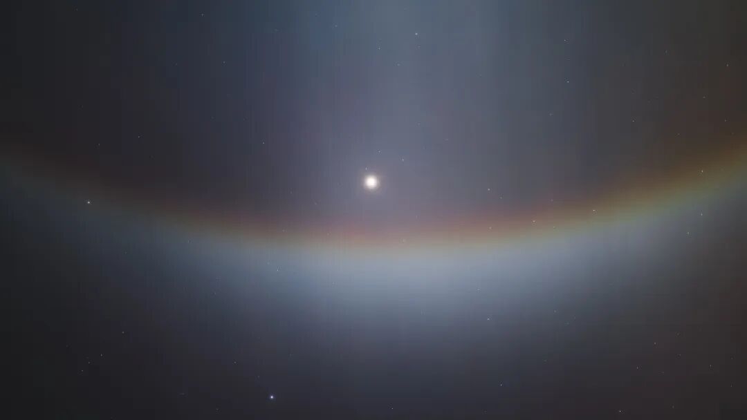皎洁的月光在夜晚撒下,细小的冰晶在高空飘浮。月光经过冰晶折射后形成了炫丽的光环,云穿过月晕也柔化了火星。此时的我仰望着天空,欣赏着这顶舞动的皇冠。