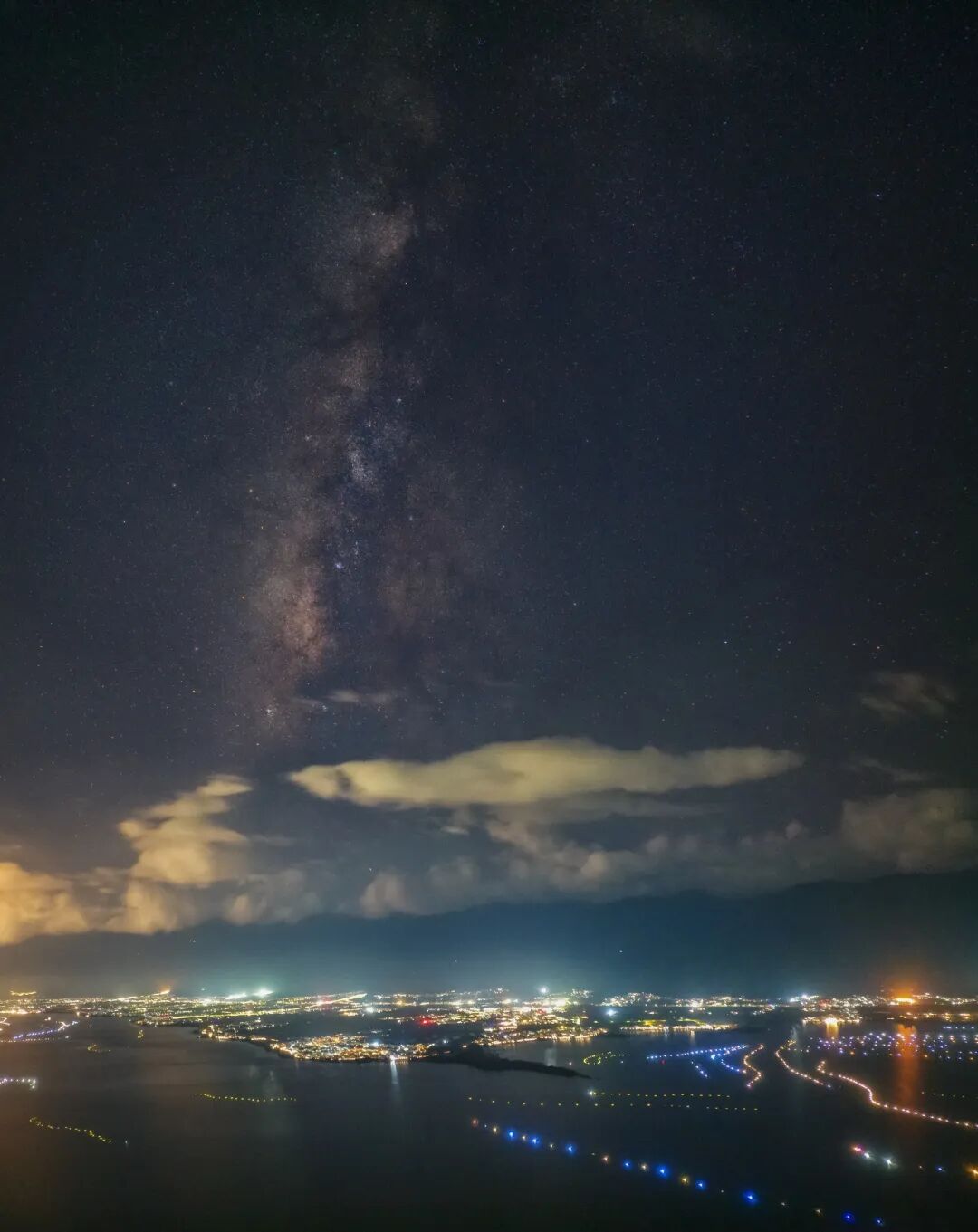 每年九月是大理洱海的开海季,每到傍晚时洱海水面上就会亮起点点星光,这其实是为了吸引水中的鱼而放置的诱鱼灯。在一个少云无月的夜晚,我将无人机飞到了洱海上空,并使用长曝光堆栈自以及三张照片拼接得到了这张图片。