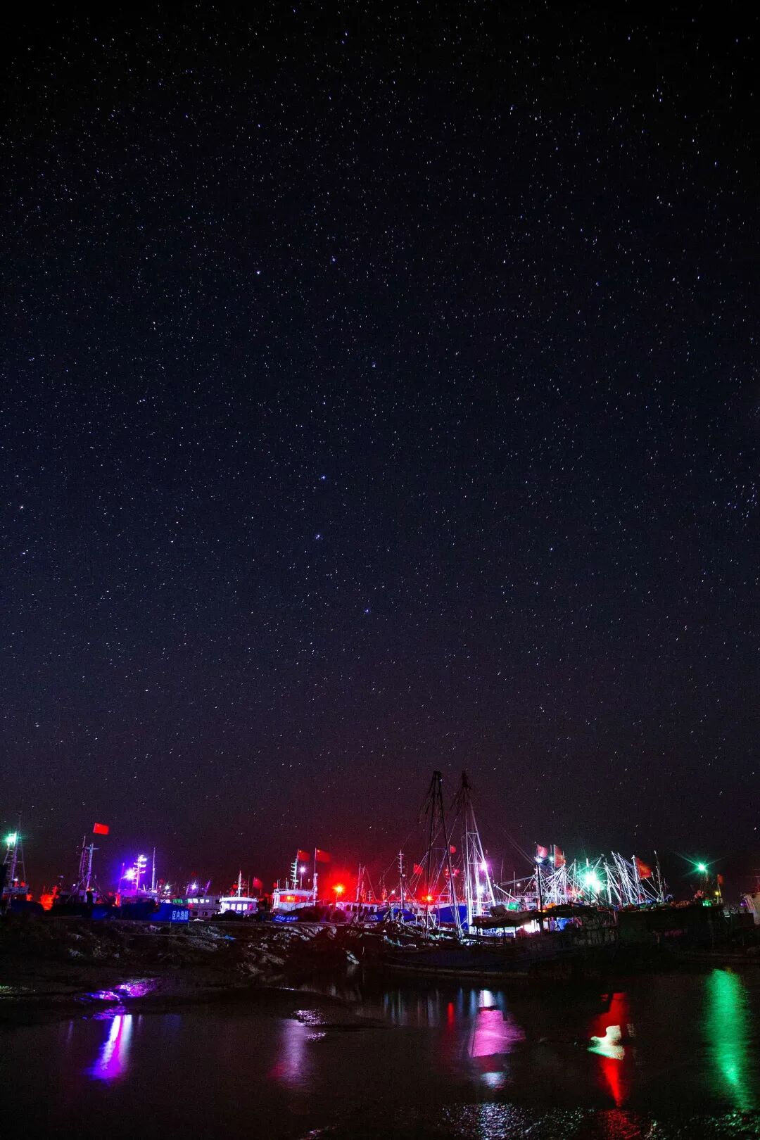 小渔港内的渔船五颜六色的信号灯与天空中的繁星,北斗七星尤为明显。