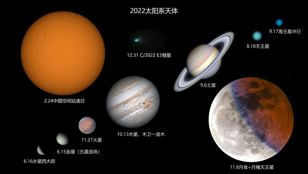元旦之际,将去年的太阳系天体摄影做了个合集,包含日月以及除地球以外的七大行星。其中日面为2月24日拍摄的中国空间站凌日,月面为11月8日千年难遇的月食+月掩天王星天文奇观(月球2点钟方向的小点是掩终的天王星),还有2022年最后一天拍摄的E3彗星。