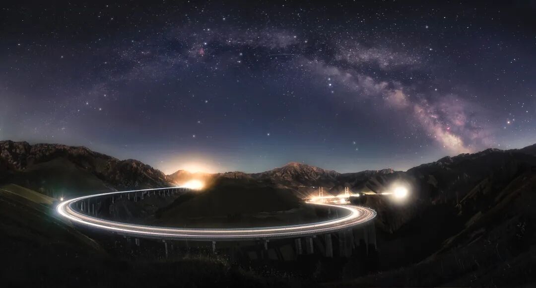 出发时天已黑,非常难爬的山坡耗时一个多小时。在山上一路寻找合适的角度以便桥面大圆弧不受前景山面的遮挡、桥上的车轨完整、并和银河拱桥同框、同时右侧的桥塔也能完整地的进入构图。长时间地尝试,车辆越来越少,后期想堆栈出漂亮完整的车轨会变得非常困难,最终采用一次长曝单张形成较为连续的圆车轨;而随着时间推移,银河拱桥也越升越高,勉强成片,希望未来有机会再去拍一次吧。