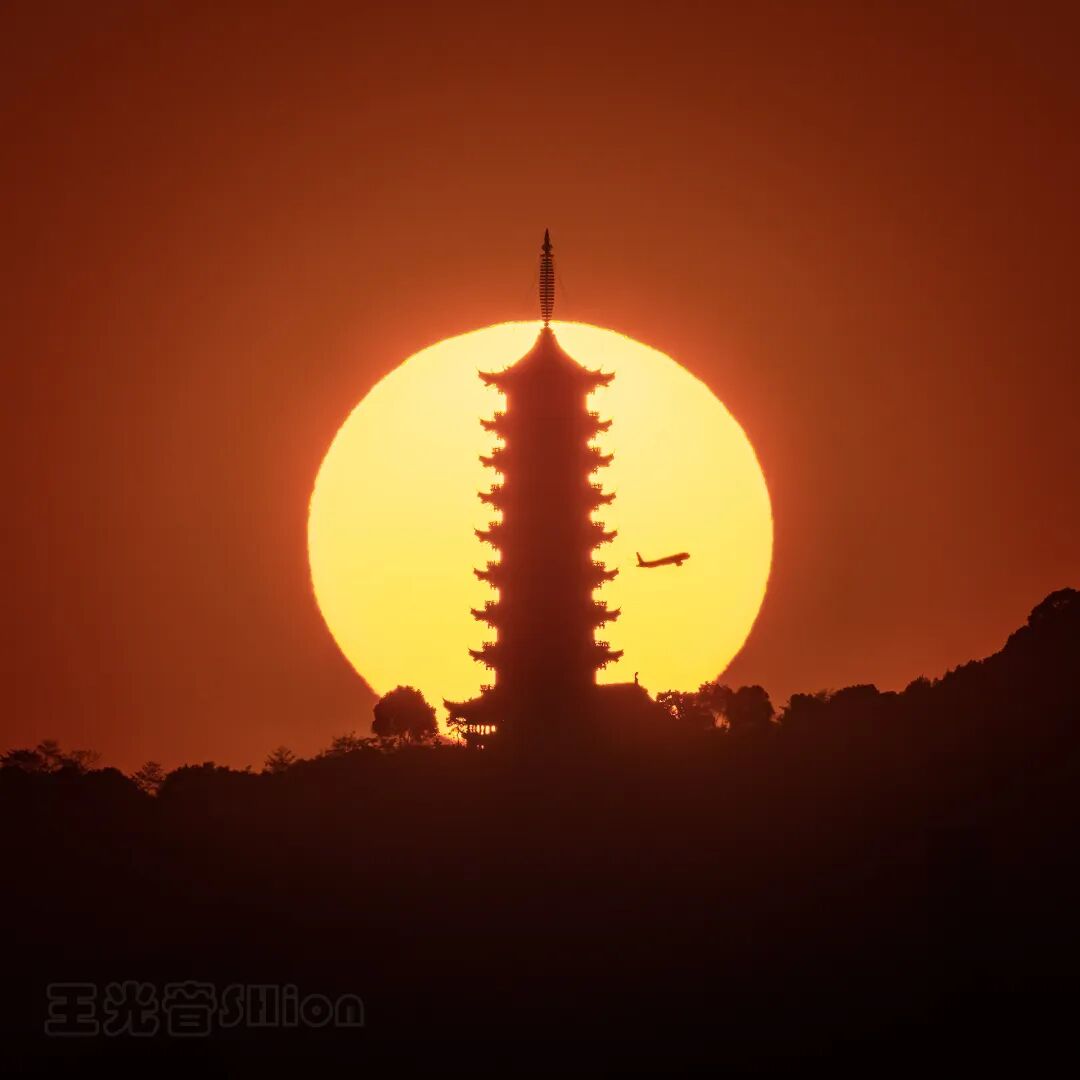 通过计划将太阳从绍兴柯桥西天竺狮林禅寺上的天竺塔这落下,恰巧碰到一架民航机驶过,定格美好的瞬间。