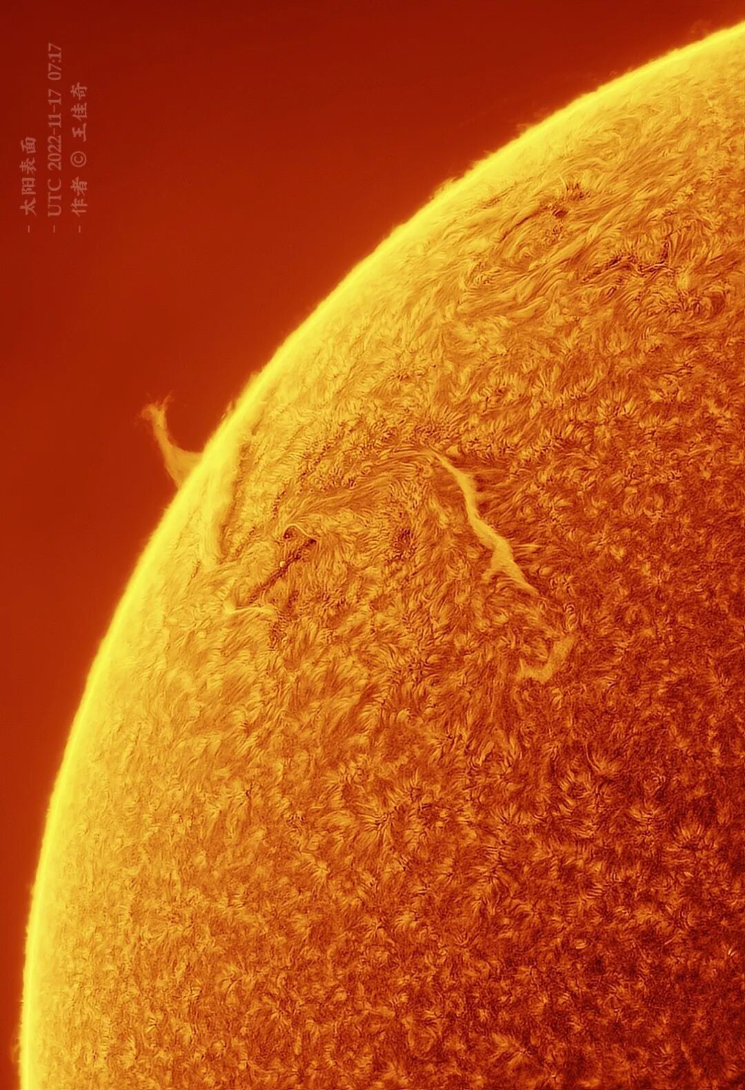 局部照片相比全日面,显得更立体,更有视觉冲击力。照片经过反色处理,可清晰看到暗条和日珥。