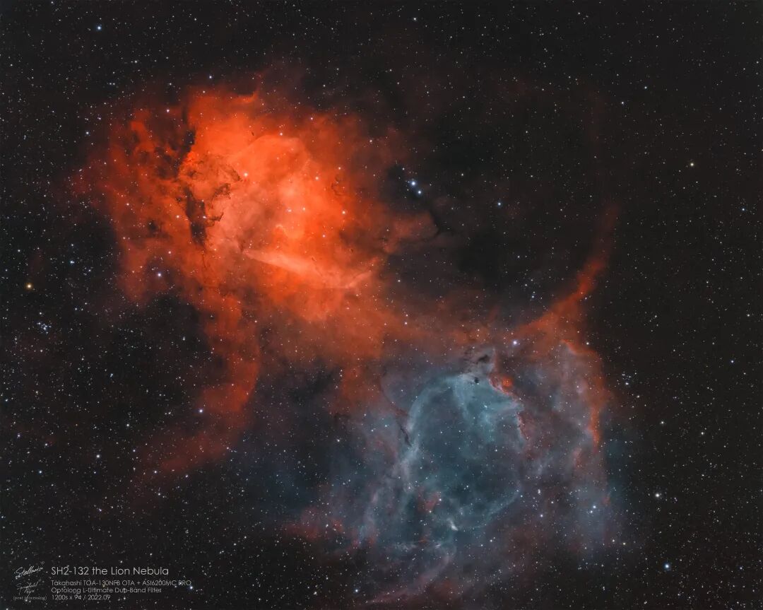 即使在SH2星表中也算的上黯淡的SH2-132星云,在长时间曝光下呈现出狮子的形态。这张照片利用双窄在城区不连续的拍摄了6个晚上,总共累积了大约31小时的曝光。