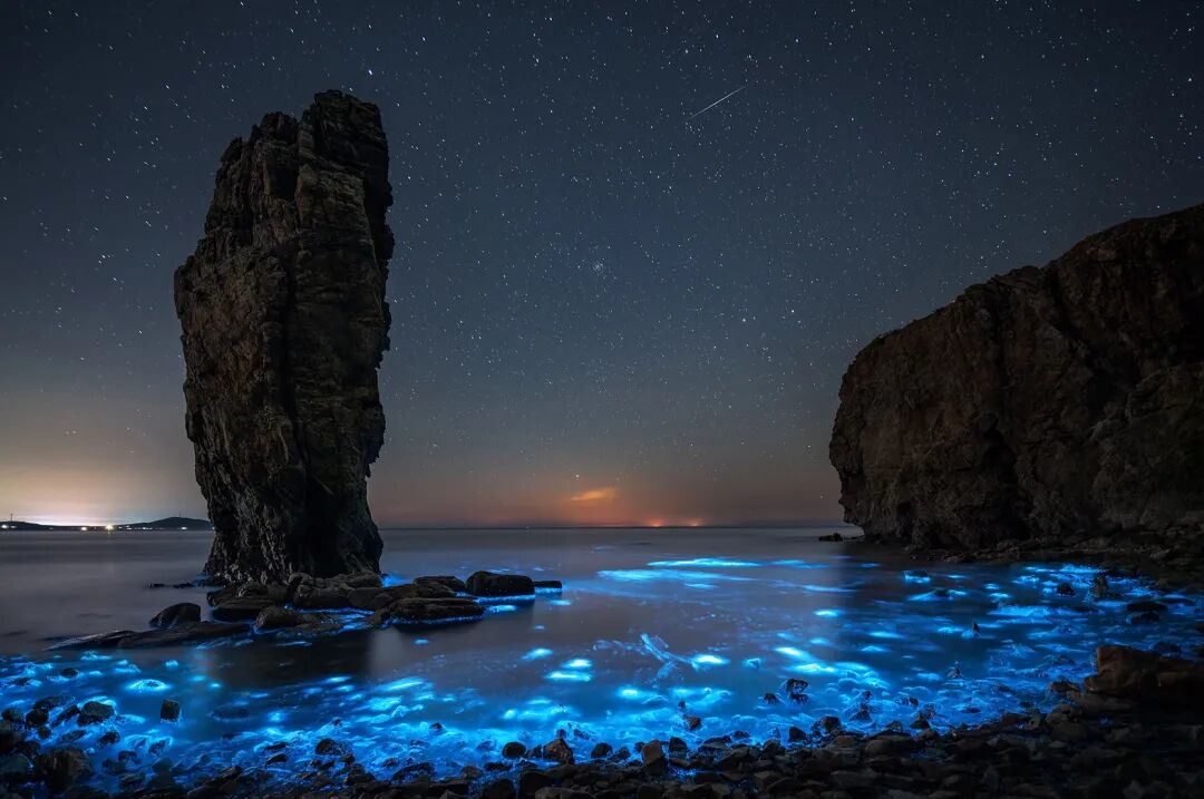 大连海景中最神奇的当属荧光海,也有人称其为“蓝眼泪”,5月出现概率最大。荧光海是罕见的海洋藻类生物发光现象,夜光藻将自身化学能转化为光能释放。而当这些生物大规模聚集发光的时候,就形成了大面积荧光海奇观。