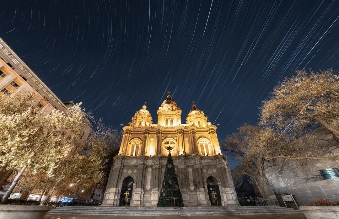 北京王府井天主教堂又称为东堂,其独特的灰色欧式尖顶建筑因其古老而散发出神秘的气息。每年12月,教堂门前还会矗立一座高大的圣诞树,以迎接即将到来的圣诞节日。入夜后,教堂上空群星璀璨,我在此默默守候,记录下了教堂上空明亮的星迹。