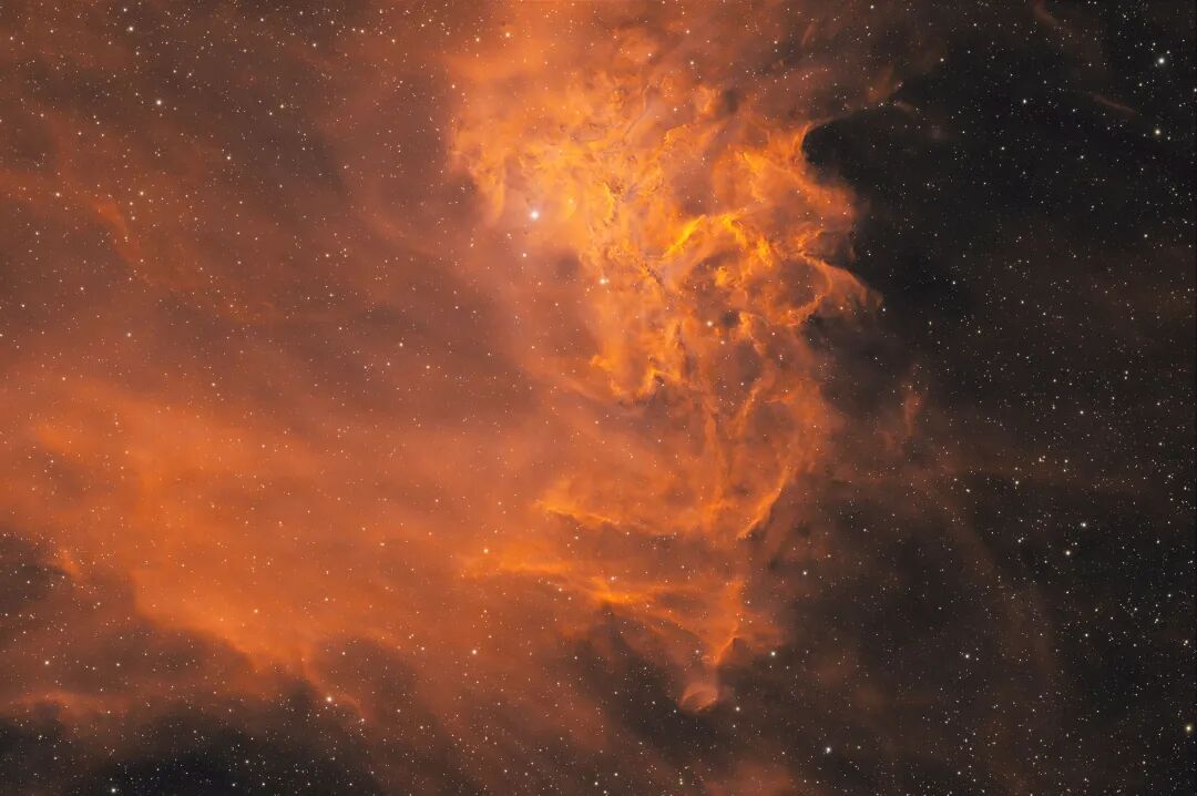 火焰星云这个名字来自其周围涟漪般的尘埃和气体条带。左侧的亮星是御夫座AE,因温度极高,所以显现为蓝色光芒,它所发出光线具有很高的能量,激发出周围气体内的电子。当电子重新被质俘获时,便会发出橙光。哈勃太空望远镜拍摄后正式命名为IC 405,距离地球约1500光年,使用普通望远镜便可在御夫座中观测到。