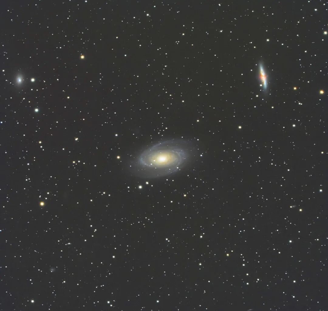 位于大熊座的这两个星系非常遥远,距离我们有1200万光年。左侧拥有巨大的旋臂和明亮的黄色核心的是旋涡星系M81,有10万光年大小。右边以红色的气体尘埃云为特征的是不规则星系M82。这一对星系被引力束缚在一起已经有10亿年了。在一系列宇宙级的近距离交会中,每个星系都受到了另一个星系引力的强烈影响。它们之间最近的一次冲突持续了约1亿年,似乎在 M81中形成了起伏的密度波, 壮大了M81的旋臂。