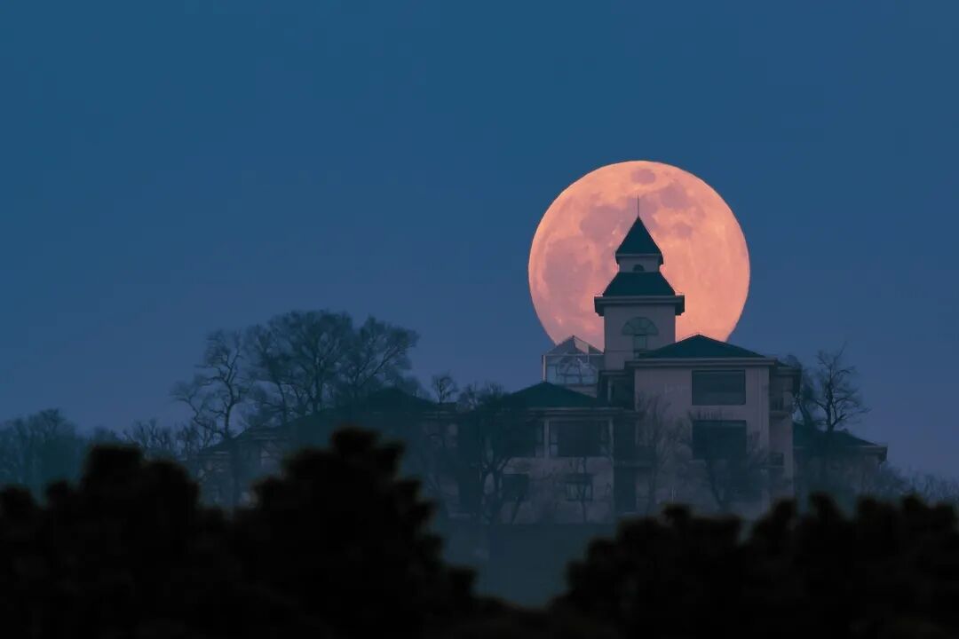 在树的那边,虎年最后一轮满月从天文台交流中心徐徐升起。