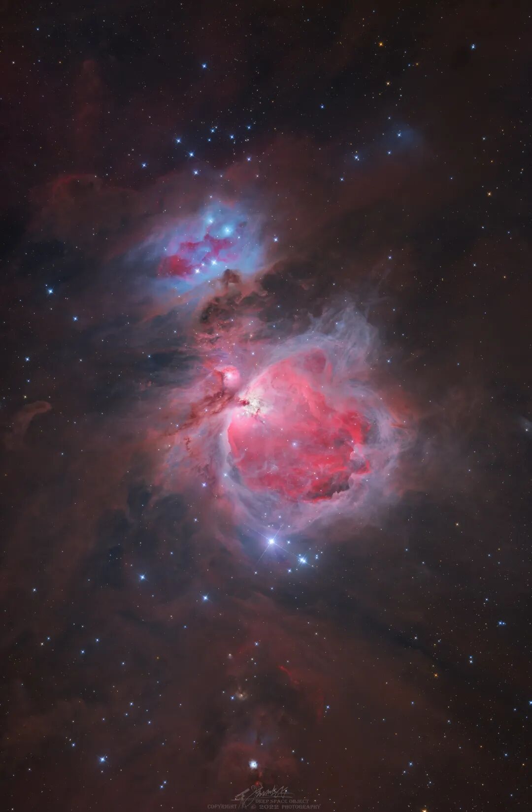 猎户座是冬季星空中最为壮观的星座,由于她亮度很大,也是冬季最好观测的深空天体之一。编号M42的猎户座大星云,是一个发射星云,它位于猎户座“宝剑”的中间。整个猎户座大星云的质量约是太阳的十万倍。这里是一个著名的恒星诞生区域,星云中很多的“球状体”就是正在形成的原恒星。