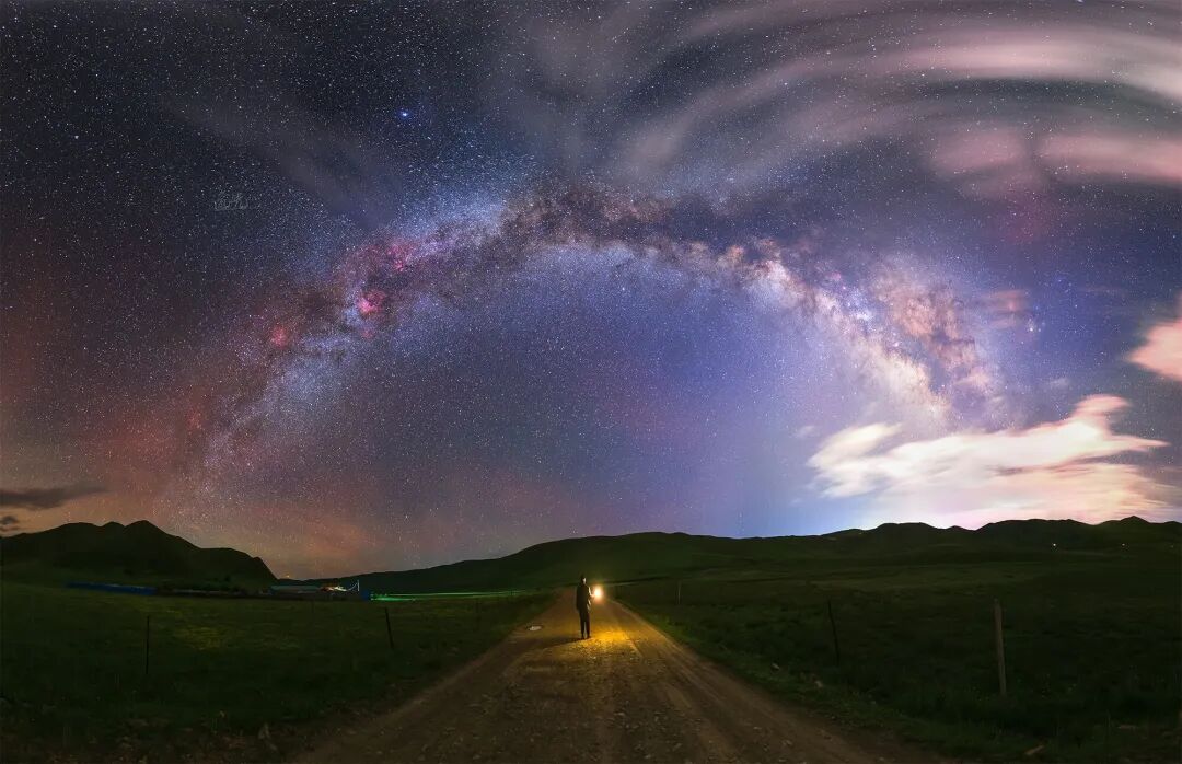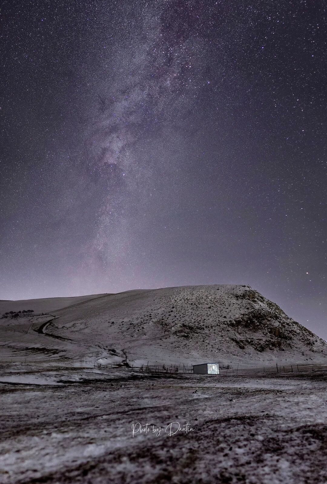 天文昏影终,银河西斜在雪原之上,星光洒落大地。从小屋沿着小路上山,能否亲手触碰到银河?