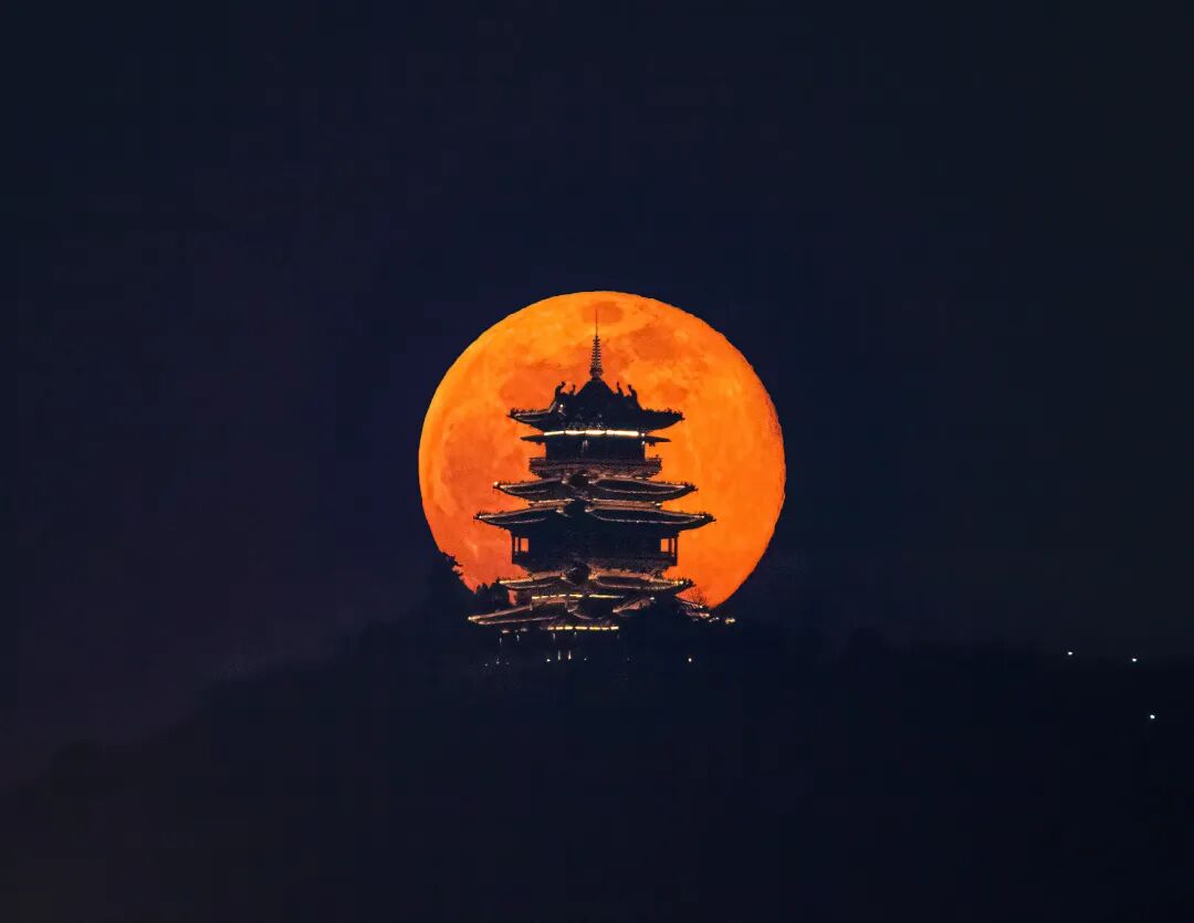 新年第一轮满月,摄于杭州城北,一次成像。当橙红色的满月升起,包住望宸阁的瞬间,想起古诗词中的意境:“不知天上宫阙,今夕是何年”。