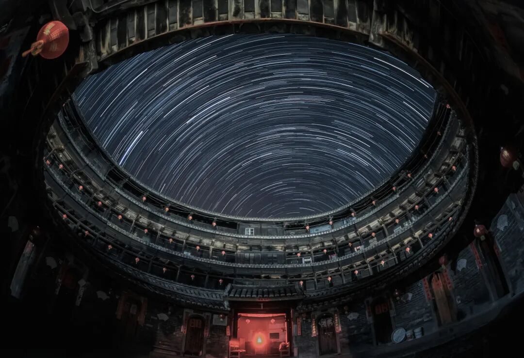 众星拱绕北极而旋转,这座楼坐北壬子向丙午之位,所以取名“环极楼”;另一说法是:环即圆,“环极”,即愿其吉祥(圆好)至极。三大特点:抗震性能超强(震缝自合)、中心点环绕回声、内部中心环无祠堂,均为永定土楼绝无仅有。堆栈之后发现北极星位是偏移楼正位的,不到三百年,不应是地球自转轴摆动造成的偏差,也不认为是先人的建造误差。我的猜测是可能因地震造成的位移——这是座饱经沧桑、充满神秘色彩的环极之楼。