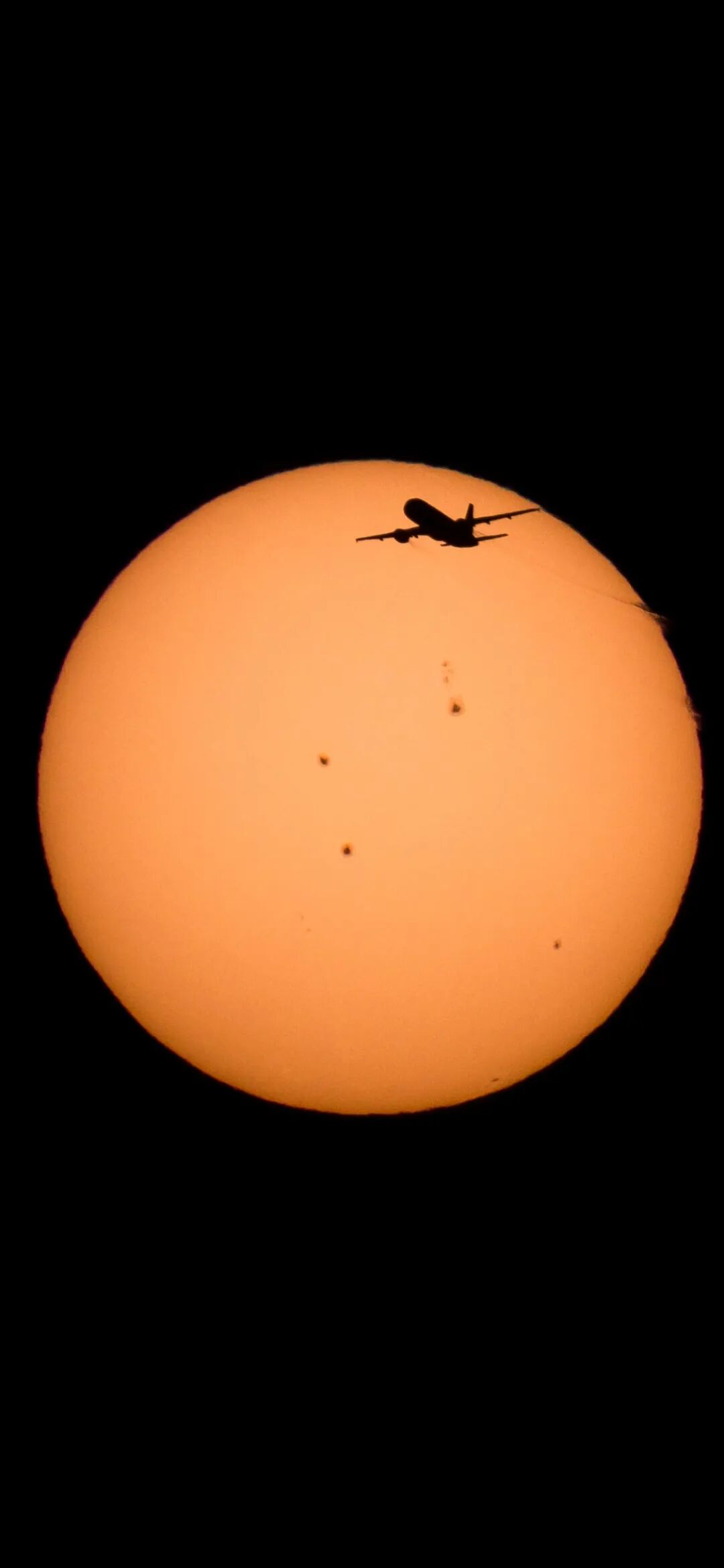 一个平平无奇的日落,翻出刚买的巴德膜准备开光拍拍太阳黑子,谁知道刚架好相机,一架飞机迎面飞来,看角度好像即将要从太阳穿过,来不及思考,快速按下快门,最终拍下了飞机凌日,当飞机的尾迹从太阳黑子掠过,行成一道靓丽的风景线。