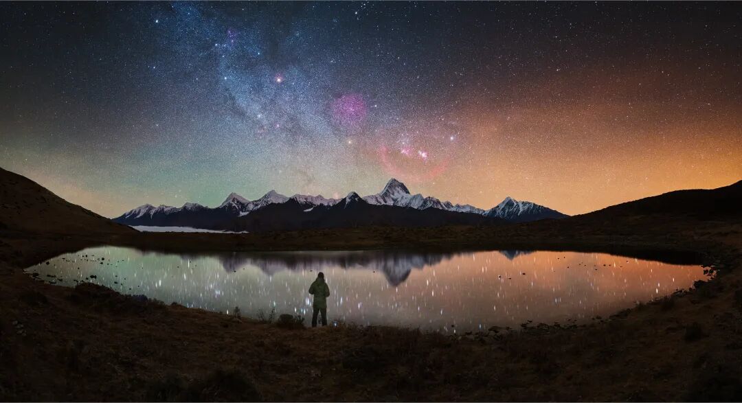 贡嘎雪山海拔7556米,来到这里前,我就提前构思好了画面,使用app模拟了猎户座升起的时间。也许是因为这里远离光污染和空气污染,令我未曾想到的是,贡嘎雪山附近的气辉特别强烈,亮度肉眼可见。这张照片展现了冬季猎户座从贡嘎雪山主峰升起的场景,同时记录下震撼的双色气辉。