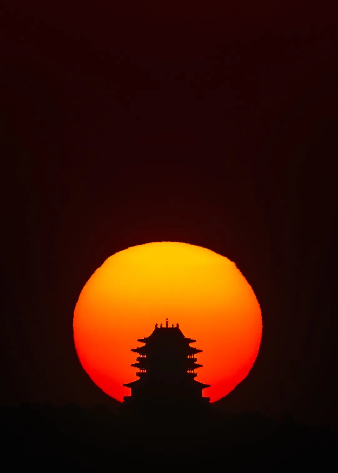 联系湖州当地摄影师,一起计划太阳从十公里外的仁皇阁处缓缓降下,踩点无误后,前往拍摄。由于距离远,相对建筑比例,显得太阳格外的大。