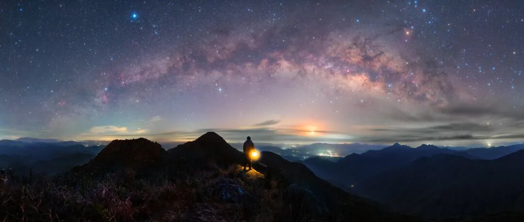经历了差点在灌木丛里迷路后,终于在山上扎营过夜。凌晨时分,一轮残月在层层叠叠的岭南群山之上升起,与初升的夏季银河构成了一只银河之眼。在拍完整组照片后,右下角的云就涌了过来,感谢天公作美让我目睹并拍下了这震撼人心的景色。