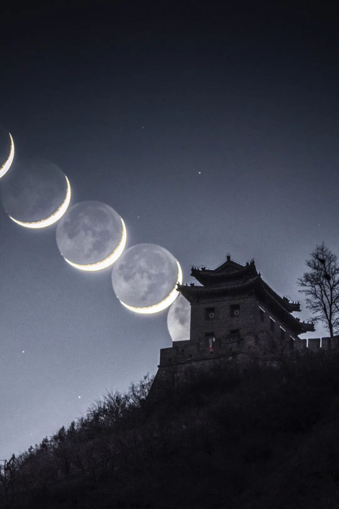 作为北京乃至中国最重要的历史地标和文化图腾,古老的长城与浪漫的月亮同框是我一直很感兴趣的题材,也是使用巧摄计划的科学摄影中实现难度较大的一类。这张照片拍摄于今年春节期间,全程月球暗面可见,就像珍珠一样,让我想到了2021年12月2日我在上海外滩拍摄的《环金串月》。