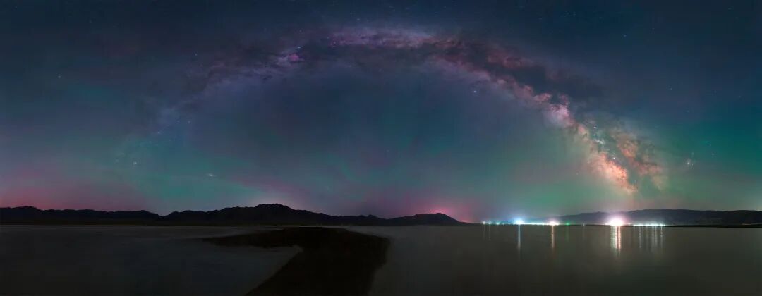哈密巴里坤幻彩湖有着非常优良的星空环境。在白天,盐湖随着光纤变化有着几种颜色故名幻彩湖;而在夜里,明亮的银河加上红绿气辉同样璀璨。