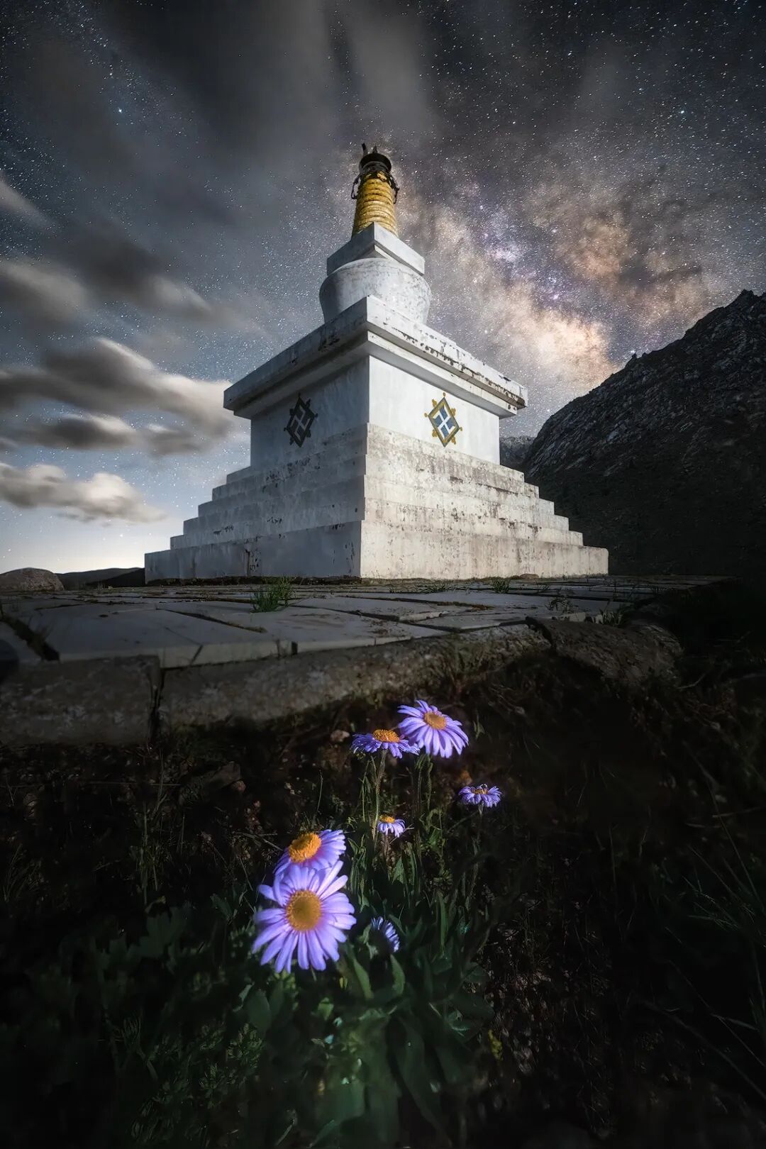当天傍晚探索落日机位时我把注意力全部放在花朵上,希望拍摄一张超广角景深合成,我记住了路过的每一簇花的地点,但是并没有等来落日和火烧云。夜里在营地休息时突然想到银心面对白塔的方向有一簇完整的花,借着微弱的月光我重新回到白塔旁,以银心和白塔为背景,拍到了期待已久的景深合成。