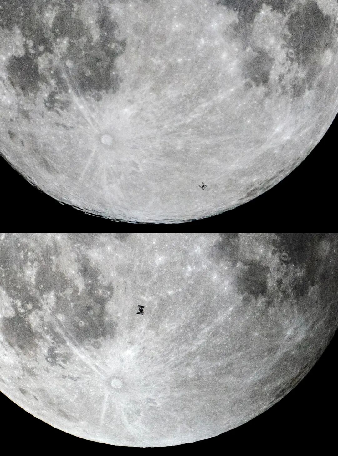 两张图均拍自江苏太仓,机位距离不远,上CSS凌满月,下ISS凌满月。两张图用相同的设备和相同参数拍摄,国际空间站距离大约 516 KM,中国的空间站距离大约 390KM。