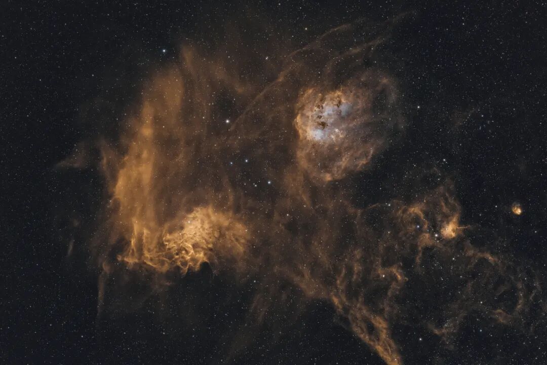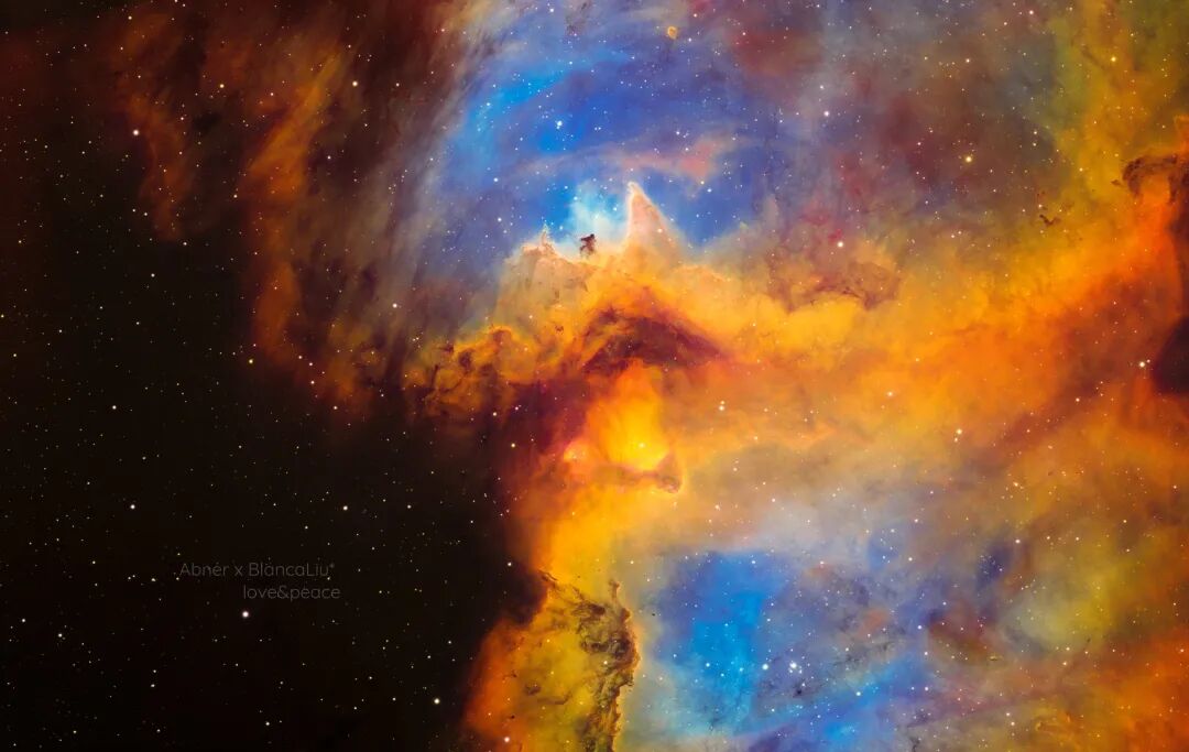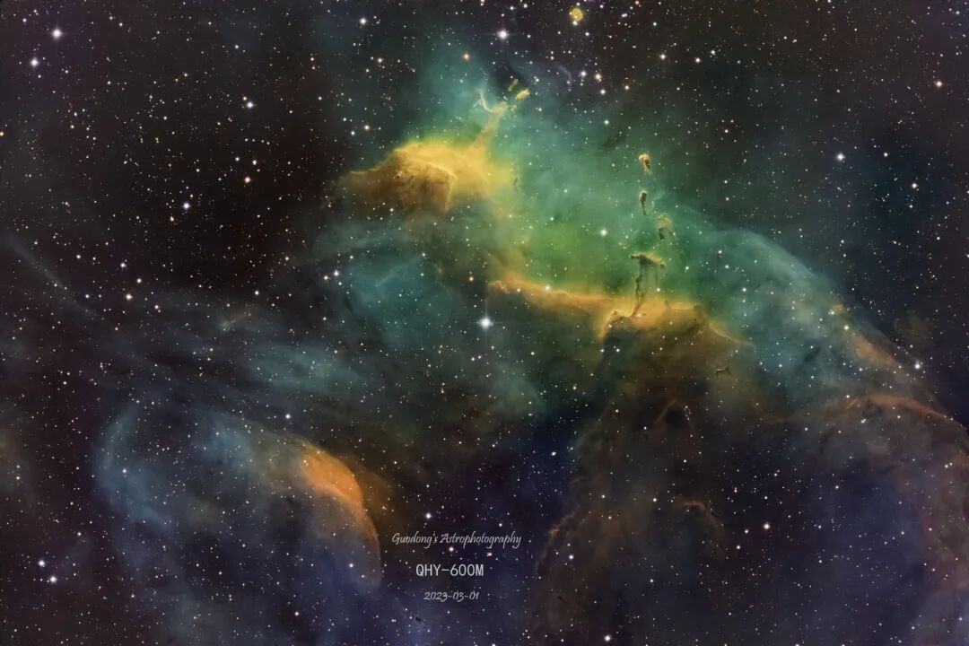 本张片子由中短焦距望远镜加上减焦镜以及全画幅相机搭配出来的极广阔视场拍出。片子中涵盖了IC405火焰星云、IC410蝌蚪星云、IC417蜘蛛星云三个目标。采用了SHO滤镜通道,突出了蝌蚪星云核心的冰蓝色以及火焰星云整体的金黄色,由此产生冰与火的对比。在宇宙面前,人类永远是个充满好奇的孩子。非常高兴能够在国家天文与大家一同享受星空的美妙。